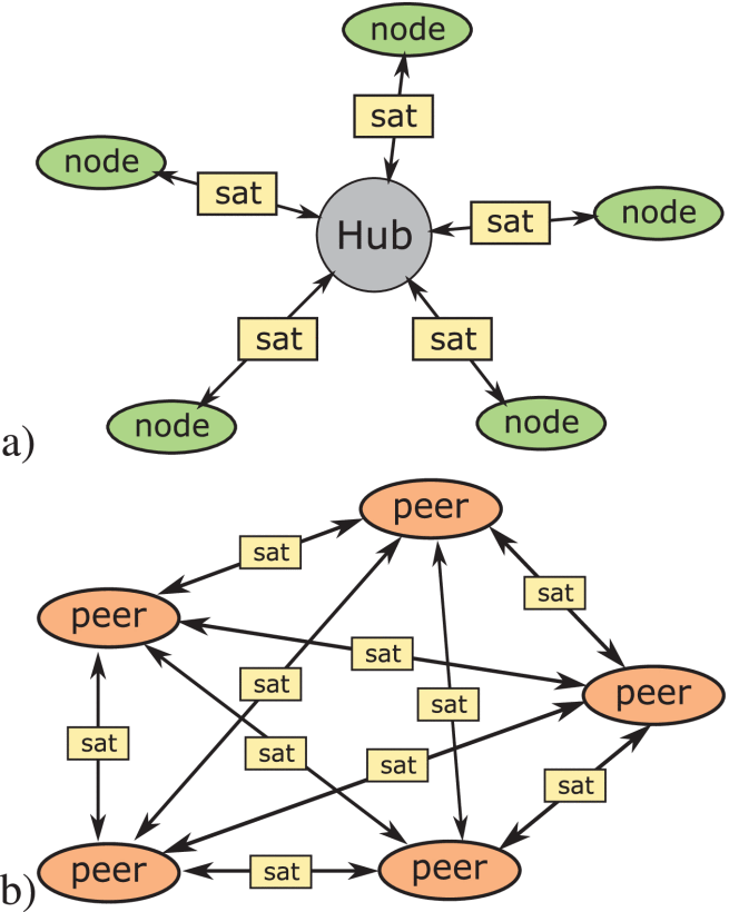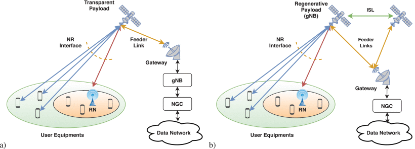 Multi-layer communications architecture. The role of satellites in the 5G ecosystem. SatCom System Architecture. Communication topology: a) star; b) mesh. 5G-NTN architecture options with a) transparent payload; b) regenerative payload. AWS Ground Station System Architecture.